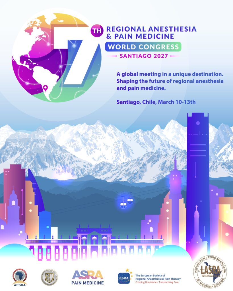 Congreso Mundial de Anestesia Regional y Medicina del Dolor (7.ª edición) Más información ¿Qué es LASRA Internacional? Es una asociación sin fines de lucro, que agrupa a médicos anestesiólogos de todo el continente creada en 1993, con el objetivo de difundir la práctica, enseñanza e investigación de la anestesia regional. Nuestra Visión y misión ¡Toda Latinoamérica unida! Nuestra Historia Regístrate Próximos eventos XII Congreso Internacional Lasra Uruguay 2026 14-16 de octubre de 2026 | Montevideo, Uruguay Más información Congreso Mundial de Anestesia Regional y Medicina del Dolor (7.ª edición) 10-13 de marzo de 2027 | Santiago, Chile Más información Evento LASRA Eventos Latinoamericanos Eventos Internacionales Sociedades hermanas Sitios de interés Regístrate ¡Síguenos en Redes Sociales!